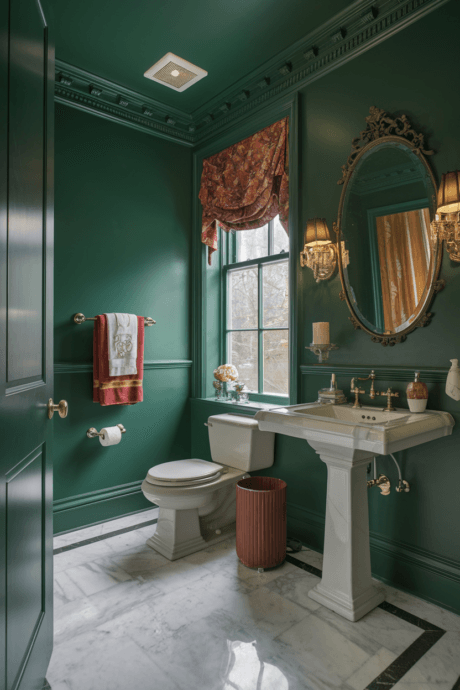 Create a sophisticated, timeless bathroom by pairing rich hunter green with warm brass fixtures and hardware. This classic combination exudes old-world elegance with a contemporary edge. Apply hunter green to walls or cabinetry, then accentuate with unlacquered brass faucets, towel bars, and cabinet pulls that will develop a beautiful patina over time. The contrast between the deep, saturated green and the glowing metallic elements creates a luxurious environment that feels both grounded and glamorous.