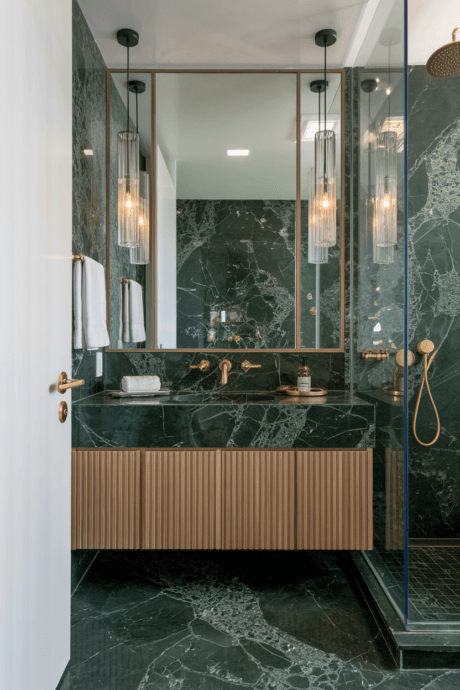 Incorporate the natural elegance of green marble with its distinctive veining patterns as countertops or accent pieces. Varieties like Verde Guatemala or Empress Green add organic sophistication to any bathroom. The unique stone formations ensure each installation is one-of-a-kind, bringing artistry and luxury to your space. Pair with simple white fixtures and minimal décor to let the marble’s natural beauty take center stage in a bathroom that balances opulence with organic elements.