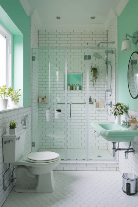 Create a fresh, clean bathroom aesthetic with a mint green and white color palette. This light, airy combination evokes the feeling of a luxury spa retreat while brightening even the smallest spaces. Use mint on walls or cabinetry, balanced with crisp white tiles, fixtures, and linens. This versatile scheme works particularly well with natural light, reflecting and amplifying brightness throughout the day while maintaining a cool, calming environment for your daily routines.