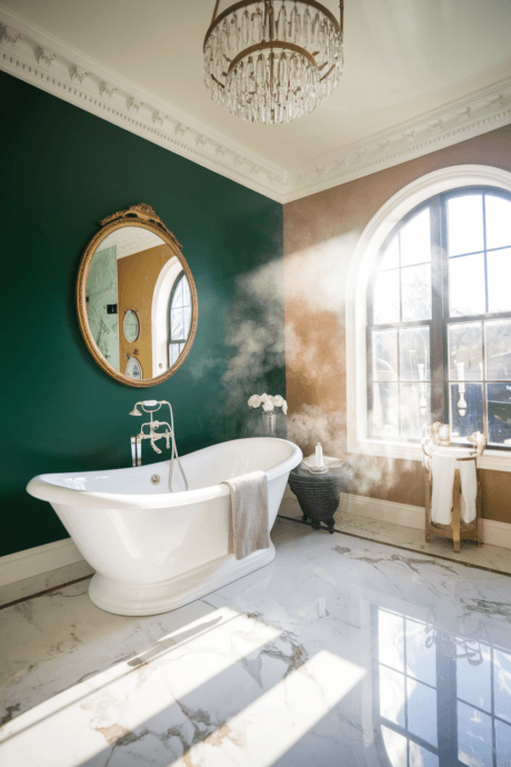 Create a stunning focal point with an emerald green accent wall that exudes luxury and drama. This jewel tone adds depth and character to your bathroom while complementing white fixtures and natural wood elements. For smaller spaces, limit this rich color to one wall to prevent overwhelming the room. In larger bathrooms, enhance the impact with gold-framed mirrors and light fixtures for a glamorous touch that feels both indulgent and inviting.