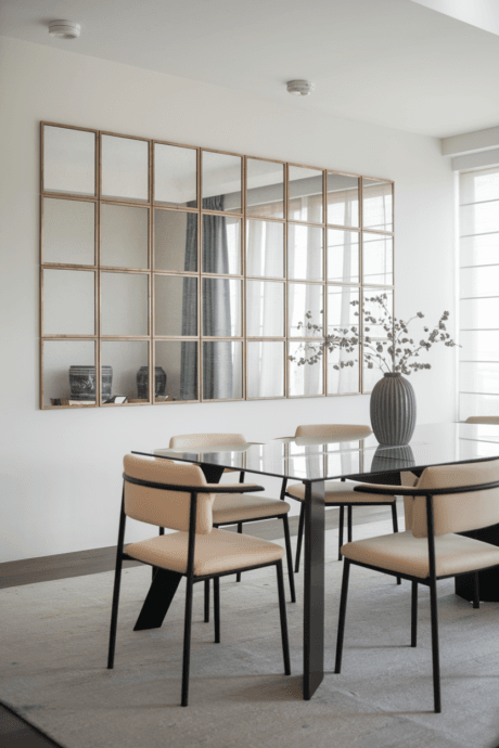 Create a modern, asymmetrical grid using rectangular mirrors of the same size but staggered placement. This calculated yet dynamic arrangement brings organized energy to your wall. Thin metal frames in matte black or brass add definition without overwhelming. This design works particularly well in dining rooms or hallways, creating rhythm and movement while expanding the perceived space.