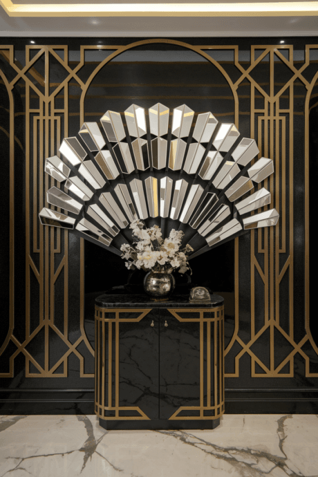 Channel the glamour of the Art Deco era with fan-shaped mirrors arranged in a semi-circular pattern. Incorporate the geometric precision and luxurious materials characteristic of this style—think gold, black, and mirrored surfaces with clean lines. This bold arrangement makes a striking statement above a console table or bed. The reflective elements amplify the opulence while adding period-specific architectural detail.