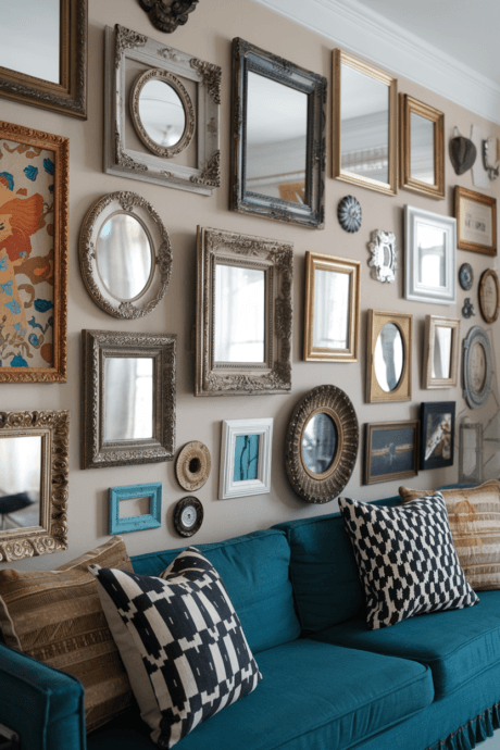 Reimagine the traditional gallery wall by using mirrors instead of artwork in decorative picture frames. Mix vintage and modern frame styles while maintaining a cohesive color palette. The varying reflective surfaces create an ever-changing display as light and movement are captured throughout the day. This approach combines the character of a gallery wall with the functional benefits of mirrors.