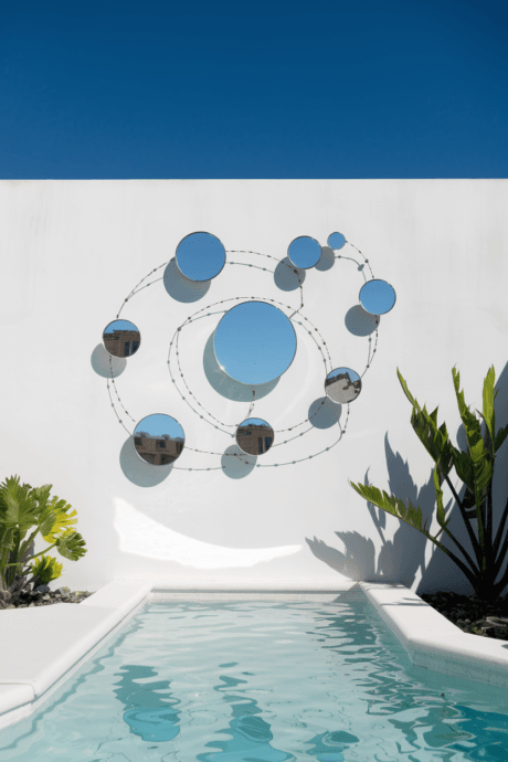 Mount circular mirrors of varying sizes so they appear to float on your wall in a constellation-like arrangement. This celestial-inspired design creates a sense of movement and cosmic energy. Use mirrors with thin frames or frameless designs for a clean, modern aesthetic. This arrangement works beautifully in minimalist spaces, creating subtle interest without overwhelming the room’s calm atmosphere.