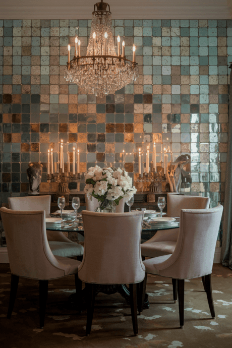 Create a sophisticated backdrop using antique-finish mirror tiles. The subtle foxing and tarnished effect of these mirrors adds depth and character without the harsh reflection of regular mirrors. Arrange in a classic grid pattern for timeless elegance. This approach works beautifully behind a bar area, in powder rooms, or as a dining room accent. The softened reflections create ambiance rather than clarity.