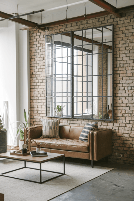 Create industrial chic with window-pane style mirrors featuring black metal framing. Arrange several in a grid or stagger them for a more relaxed look. The strong geometric lines add architectural interest while maintaining an open feel. This style works particularly well in loft spaces, urban apartments, or as a counterpoint to softer design elements. The defined sections create intriguing fractured reflections.