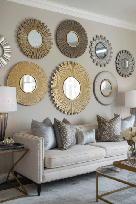 Create a stunning focal point by arranging various sizes of sunburst mirrors on your wall. The radial design mimics the sun’s rays, adding warmth and visual interest. Mix gold, silver, and copper finishes for an eclectic look, or stick to one metallic tone for a more cohesive appearance. This arrangement works particularly well above a console table or sofa, bringing dynamic energy to any room.
