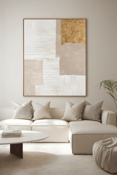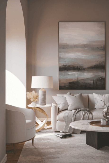 Commission or select an oversized abstract artwork in tonal neutrals with subtle textural elements—perhaps incorporating sand, plaster, or metallic leafing. Position as the dominant focal point in the room, allowing ample negative space around it. The monumental scale creates impact without color intrusion, becoming an architectural element in its own right. This singular artistic statement anchors your design while maintaining the disciplined palette, proving neutral need not mean without artistic expression.