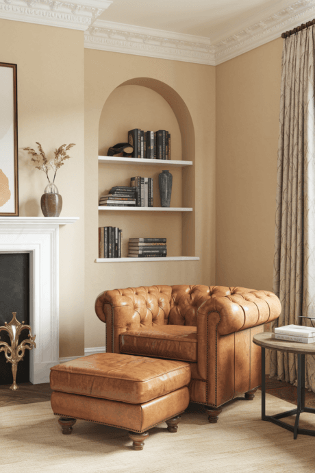 Incorporate natural leather elements in caramel, taupe, or greige tones. A leather pouf, chair, or collection of books with leather spines add warmth and natural patina. Leather’s ability to age beautifully makes it perfect for neutral spaces focused on timelessness rather than trends. The material brings a masculine edge that balances softer elements, creating tension between different tactile experiences that makes a space feel complete and considered.