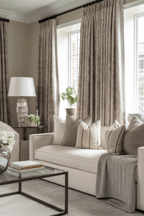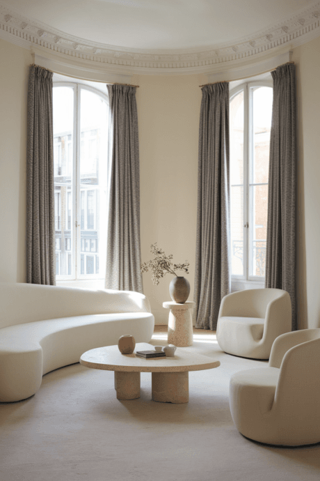 Install floor-to-ceiling window treatments in heavyweight Belgian linen or wool sateen with architectural detailing—inverted pleats, hidden hardware, and weighted hems. Choose a tone that creates subtle contrast with wall surfaces while maintaining the neutral story. The exaggerated height creates a vertical line that visually extends your ceiling while the substantive fabric adds acoustic benefits. The precise tailoring of these textile elements brings couture-level refinement to architectural openings.
