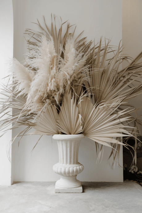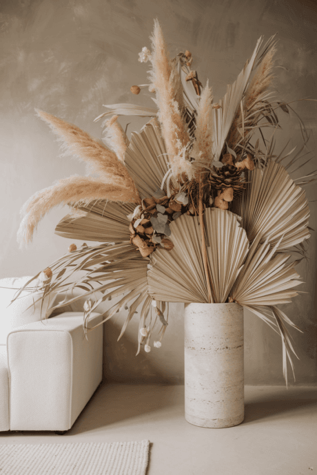 Integrate oversized dried arrangements using bleached or naturally neutral botanical elements. Combine towering pampas grass with dried palm fronds, preserved eucalyptus, and dried lunaria in monumental stone vessels. These sculptural compositions add dramatic height and organic form while maintaining the neutral palette. The preserved elements bring nature’s architecture indoors in a long-lasting format that requires no maintenance while adding vertical dimension and seasonal texture.