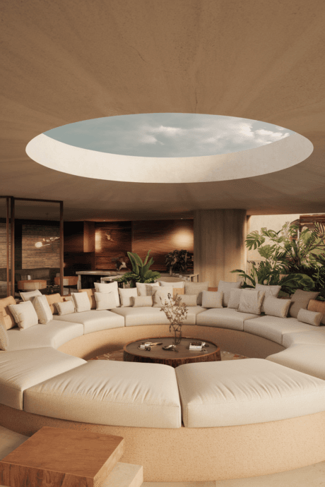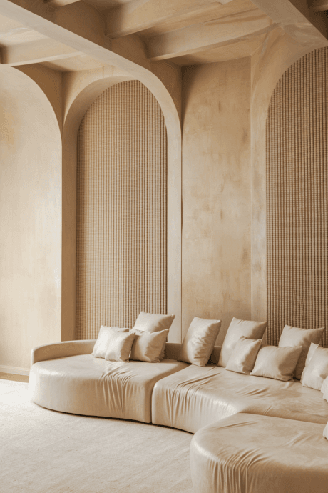 Create an intimate sunken seating area with built-in sofas in soft neutral upholstery. This architectural feature becomes the heart of your living space, encouraging connection and conversation. The lowered elevation creates inherent coziness while the continuous seating maximizes social interaction. This retro-inspired feature feels newly relevant in today’s home-centered lifestyle, creating a distinctive layout while maintaining a calm, neutral aesthetic.