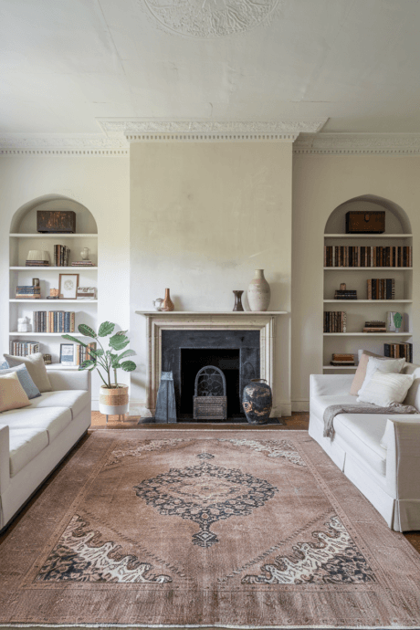 Build your design around a weathered antique carpet in faded, time-softened hues. Select pieces where what were once vibrant colors have mellowed into sophisticated neutral tones through decades of natural aging. The classical patterns provide subtle structure while the patina speaks to history and authenticity. These textile artifacts ground contemporary elements with their inherent soul and narrative quality, creating spaces that feel timeless rather than trendy.