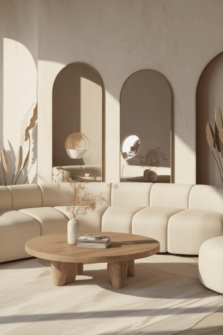 Soften a neutral space with architectural elements that prioritize organic forms. Install arched doorways, curved partition walls, rounded built-ins, and circular windows. Complement with furnishings featuring sweeping lines—a crescent-shaped sofa, cylindrical side tables, and dome-shaped lighting. These flowing forms create natural movement through the space while softening transitions between areas. The curvilinear approach feels inherently natural and restful, creating spaces that guide the eye in graceful arcs.