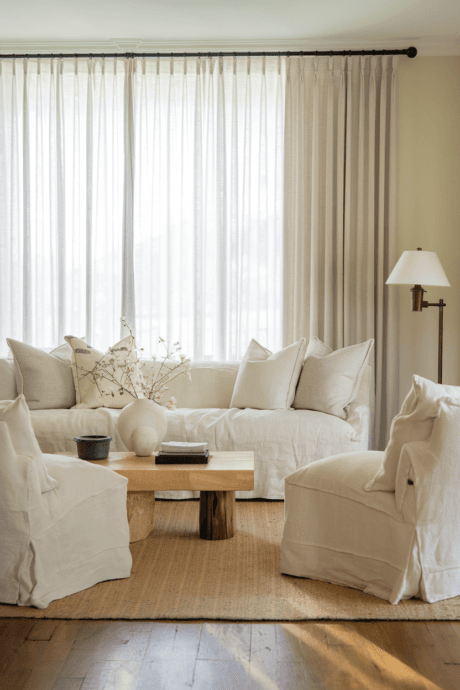 Center your design around the inherent beauty of natural linen in its many forms. Choose a generously proportioned sofa in undyed flax linen, accent chairs in oatmeal tones, and relaxed roman shades in ivory Belgian linen. The fabric’s characteristic irregular weave and subtle variations create immediate visual interest while the gentle rumpling that occurs with use adds character that improves over time. This approach celebrates imperfection and authenticity while maintaining elegant simplicity.