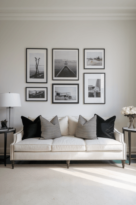 Transform a wall into a curated exhibition with black and white photography, pencil sketches, and minimal line drawings in slender frames. Arrange with generous negative space, creating a composition that breathes. The achromatic artwork complements your neutral palette while adding narrative richness without color disruption. This approach elevates everyday spaces with cultural and artistic references, creating a sophisticated backdrop that engages viewers intellectually while maintaining visual serenity.