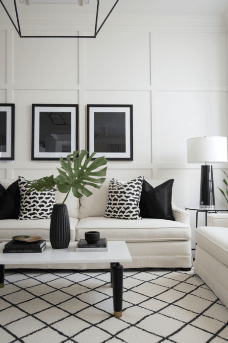 Introduce deliberate contrast with strategic black elements against a pale neutral canvas. Place matte black picture frames, blackened steel table bases, and charcoal ceramic vessels as visual anchors throughout the space. These dark punctuation marks create necessary contrast that helps define the architecture of your room. The careful opposition makes surrounding neutrals appear more luminous and purposeful, bringing definition to spaces that might otherwise feel weightless.