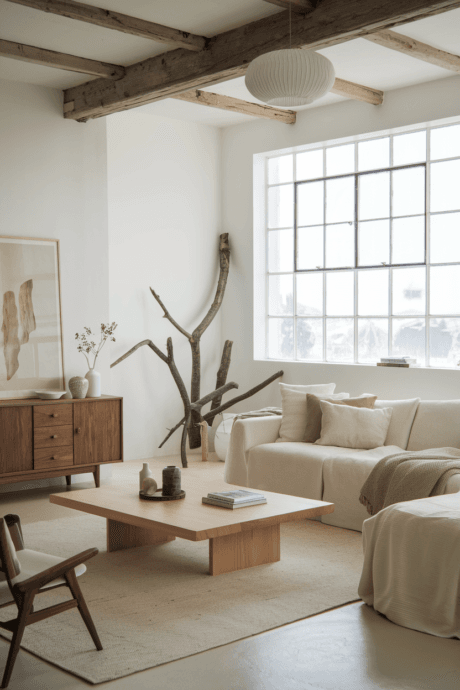 Design a space where wood becomes the protagonist in various finishes and forms. Combine bleached oak flooring with walnut shelving, ash furnishings, and driftwood sculptural pieces. The diverse wood grains create natural pattern while sharing the neutral spectrum. Each wood type brings its own character—ash for elegance, walnut for richness, oak for timelessness—creating an organic narrative that connects your interior to nature’s inherent beauty while maintaining sophisticated restraint.