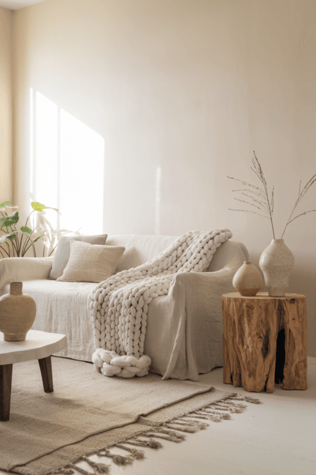 Create depth in a monochromatic space by orchestrating multiple textures in harmony. Layer a chunky hand-knit merino throw across linen-upholstered seating atop a hand-tufted wool rug with subtle geometric patterns. Incorporate matte ceramic vessels alongside polished marble accents and hammered metal decorative objects. This multisensory approach engages touch while maintaining color restraint, proving neutrals can create rich, layered experiences that invite both visual and tactile exploration.
