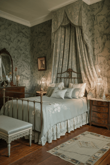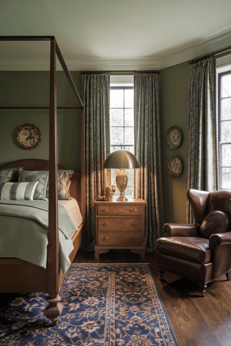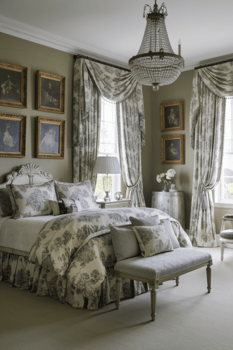 Pair sage green with traditional toile patterns for a classic, timeless bedroom with historical references. Use sage on walls with toile bedding, or reverse with sage upholstery and toile wallpaper as an accent. This combination honors sage’s heritage as a historical paint color while creating visual interest through pattern. Complete the look with antique or reproduction furniture with elegant silhouettes and refined details.