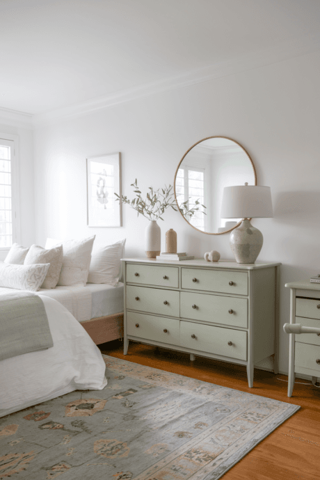 Make a statement with larger furniture items in sage green, such as dressers, nightstands, or vanities. Whether through painted vintage pieces or contemporary upholstered items, sage furniture creates substantial color blocks that anchor the room. This approach is ideal for renters or those hesitant to commit to sage walls, offering similar impact with greater flexibility for future changes.