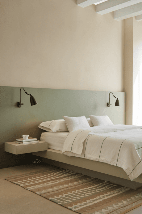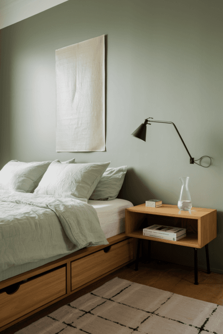 Create a distinctive focal point by applying sage green specifically to the wall behind your bed. This targeted approach defines the sleeping area while adding color in a measured way. Extend the paint slightly wider than the bed itself for proper proportions. Complement with artwork or wall sconces mounted on the sage section. This technique is particularly effective in studio apartments or open-concept spaces to define zones.