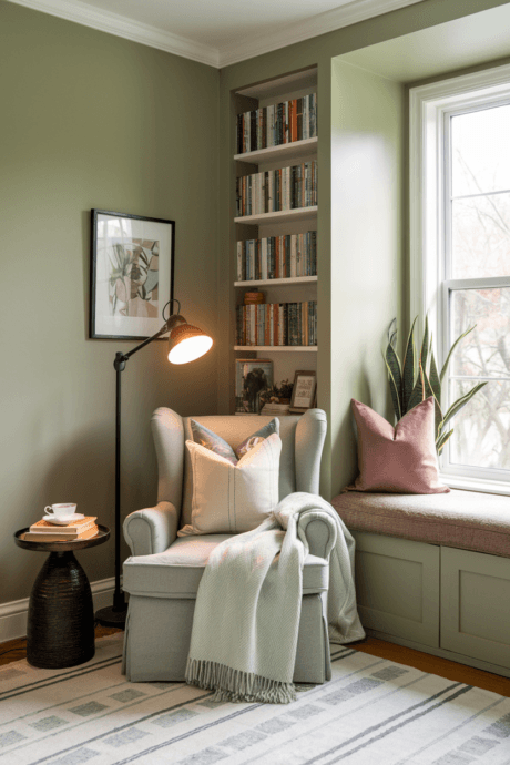 Carve out a dedicated reading retreat by painting a corner or window alcove in comforting sage green. Install a window seat or position a comfortable armchair with proper lighting and a small side table. The sage backdrop creates a cocoon-like atmosphere perfect for escaping into books. Enhance with plush cushions, a soft throw, and shelving for favorite reads and decorative objects.