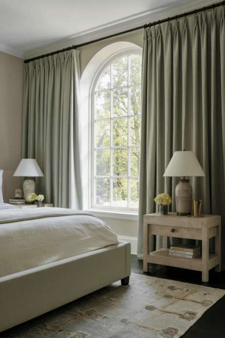Make a statement with sage green curtains, roman shades, or blinds. Window treatments in this soothing color filter light beautifully, casting a gentle glow throughout the space. Choose lightweight linen for an ethereal effect or velvet for dramatic luxury and improved room darkening. Extended ceiling-to-floor curtains create the illusion of higher ceilings while adding vertical color that doesn’t overwhelm the space.