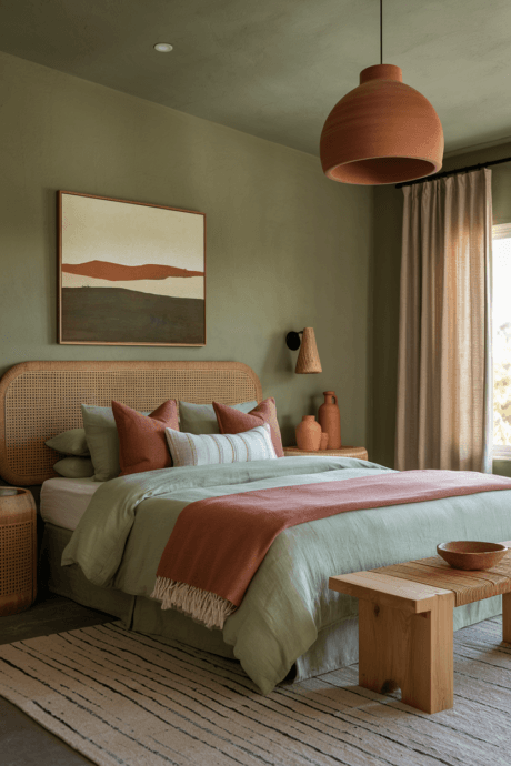 Balance sage green’s coolness with the warmth of terracotta and clay tones. This earthy combination feels grounded and organic, reminiscent of garden landscapes. Incorporate terracotta through textiles, ceramic lamps or vessels, and artwork. The contrast between cool sage and warm clay creates visual harmony while expanding the nature-inspired palette beyond a single color family.