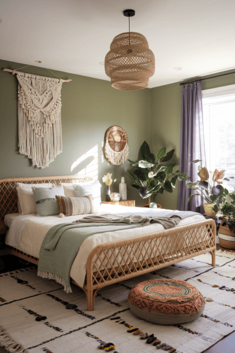Infuse sage green with bohemian elements for an eclectic, free-spirited bedroom. Layer patterned textiles, macramé hangings, and global-inspired accessories against sage walls or bedding. Incorporate natural materials like rattan, bamboo, and unfinished woods alongside plants and handcrafted objects. This approach celebrates sage’s natural origins while creating a personalized space filled with texture, pattern, and collected treasures.