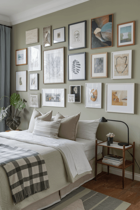 Create a striking gallery wall of artwork and photographs against a sage green background. The muted green serves as the perfect canvas for displaying collections, making colors pop while providing a more interesting alternative to standard white walls. Mix frame styles and art genres while maintaining some element of cohesion through color, theme, or frame finish for a curated rather than chaotic effect.