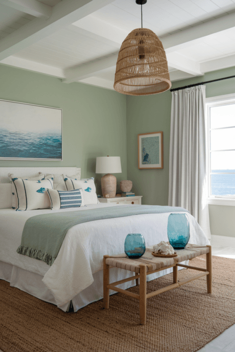 Blend sage green with coastal elements for a fresh, breezy retreat. Incorporate whitewashed woods, jute rugs, linen curtains, and blue accents reminiscent of sea and sky. This combination softens traditional coastal palettes while maintaining the style’s light, airy quality. Add collected shells, coral pieces, or maritime artwork to reinforce the coastal connection without resorting to obvious beach-themed decor.