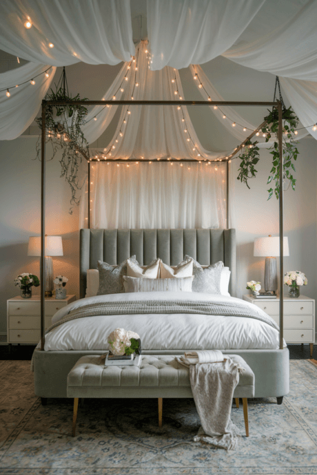 Make a dramatic statement with a sage green canopy or four-poster bed. Whether upholstered in sage velvet or painted in a sage finish, this architectural bed style creates a room-within-a-room effect. Enhance with draped fabrics, string lights, or hanging plants to create an enchanting focal point. This approach works in both traditional settings and more contemporary spaces when paired with simplified linens and minimal accessories.
