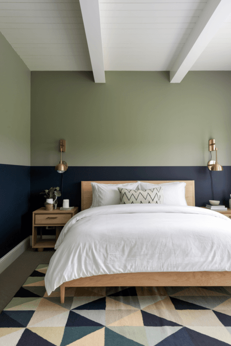 Experiment with color blocking by combining sage green with navy blue for a bold yet still sophisticated palette. Use these colors to define different zones within the bedroom or to highlight architectural features. The contrast between these nature-inspired hues creates visual interest while maintaining a cohesive, grounded aesthetic. Add natural wood tones and white accents to balance the rich colors.