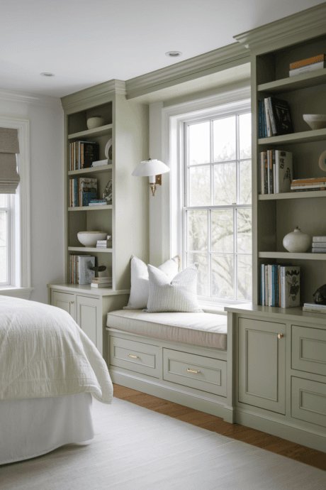 Invest in custom sage green cabinetry, bookcases, or window seats to add both color and functionality. Built-in elements painted in sage create architectural interest while providing storage solutions that reduce clutter. The color makes these features feel intentional and integrated rather than utilitarian. Style shelves with books, ceramics, and personal objects in complementary tones to create a curated display against the sage backdrop.