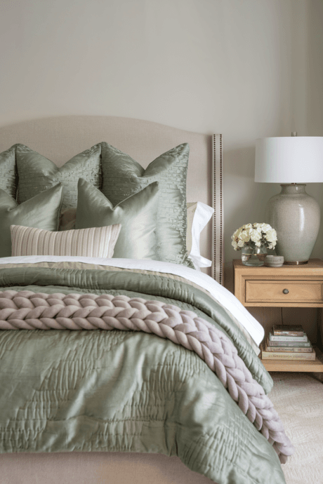 Create a luxurious bed through layered sage green textiles in varied textures and tones. Combine linen sheets, velvet cushions, chunky knit throws, and quilted comforters in a range of sage shades from light and silvery to deep and forest-influenced. The monochromatic approach creates depth through textural variation rather than color contrast. This creates a sumptuous focal point even in rooms with neutral walls.