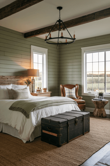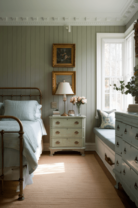 Install sage green wall paneling for architectural interest and timeless appeal. Whether using beadboard, shiplap, or classic board and batten, painted paneling adds texture and dimension beyond flat painted surfaces. This approach works beautifully in traditional and transitional bedrooms, offering sophistication with a hint of heritage style. Complement with antique or vintage furniture pieces for a curated, collected look with historical resonance.