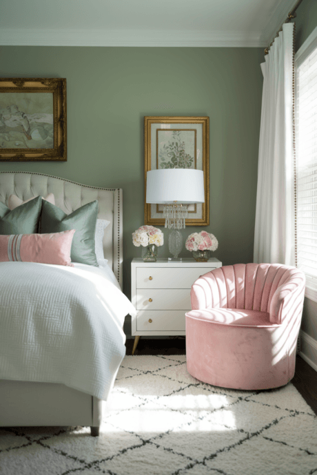 Create a soft, romantic palette by pairing sage green with blush pink accents. This unexpected color combination brings feminine charm while maintaining sophistication. Use sage as your base on walls or larger furniture pieces, then layer in blush through pillows, throws, artwork, or a statement chair. The contrast is subtle yet effective, creating visual interest while preserving the room’s serene quality.