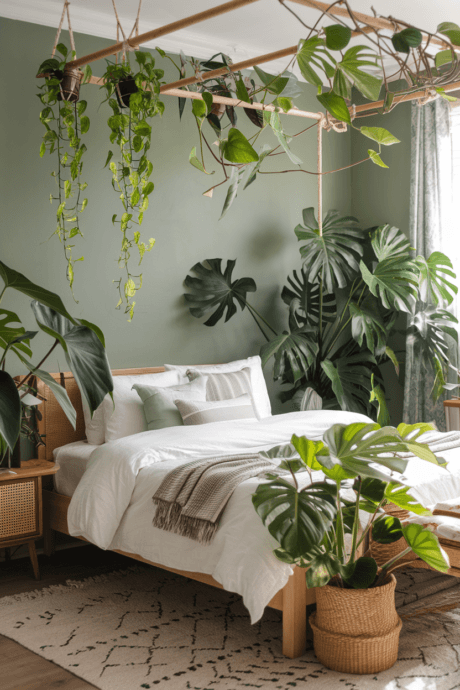 Enhance sage green’s natural connections by incorporating abundant plant life. Position a variety of indoor plants in different heights and textures against sage walls or bedding for a lush, revitalizing atmosphere. Consider hanging plants, potted floor specimens, and small bedside varieties for a multi-layered effect. This approach amplifies sage’s calming properties while improving air quality and bringing vibrant life into your personal sanctuary.