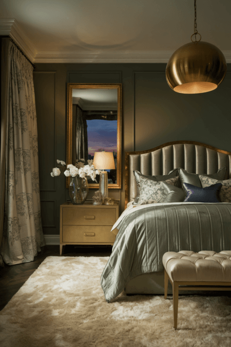 Elevate sage green with metallic gold accents for a sophisticated, luxurious aesthetic. Incorporate gold-framed mirrors, light fixtures with brass finishes, and decorative objects to add warmth and elegance. The earthy quality of sage prevents the gold from feeling ostentatious, while the metallic elements bring a touch of glamour to the organic palette. Complete the look with velvet pillows and a plush area rug for textural contrast.