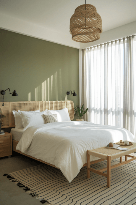 Create a focal point by painting a single wall in a rich sage green shade. This technique adds depth and interest without overwhelming the space. Pair with crisp white bedding and natural wood furniture for a balanced, organic feel. The contrast between the colored wall and lighter surrounding walls draws the eye while maintaining the room’s peaceful ambiance. Consider adding textural elements like a woven headboard to enhance the natural aesthetic.