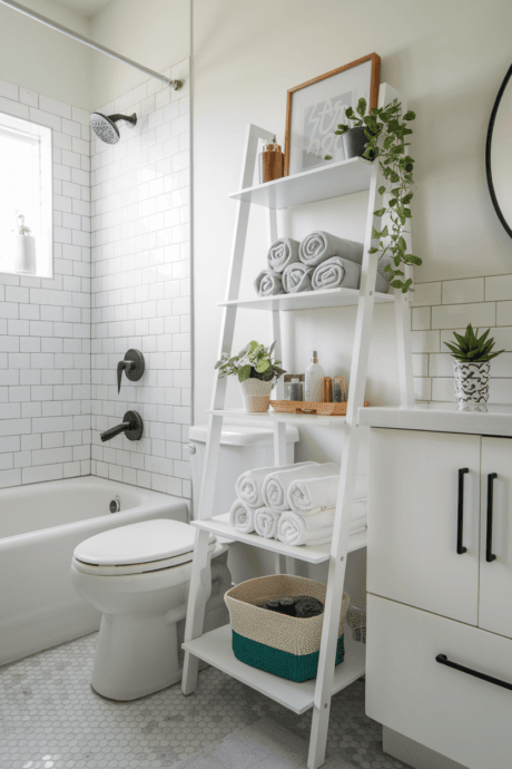 Utilize the vertical space above your toilet with a ladder-style shelving unit designed to fit around the tank. These freestanding shelves require no wall mounting, making them perfect for renters. The graduated depth of the shelves keeps items accessible while maximizing the awkward space that often goes unused in small bathrooms, providing storage for toiletries and decorative elements.