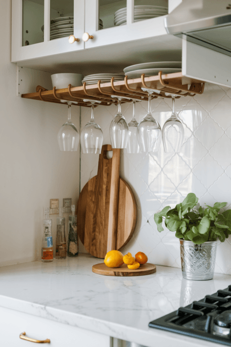 Mount wine glass racks underneath kitchen cabinets to store stemware without using valuable cabinet space. This solution keeps fragile glasses safely stored while creating an attractive display. The unused area beneath cabinets becomes functional storage, and having glasses suspended upside down prevents dust accumulation inside them while keeping them ready for use.