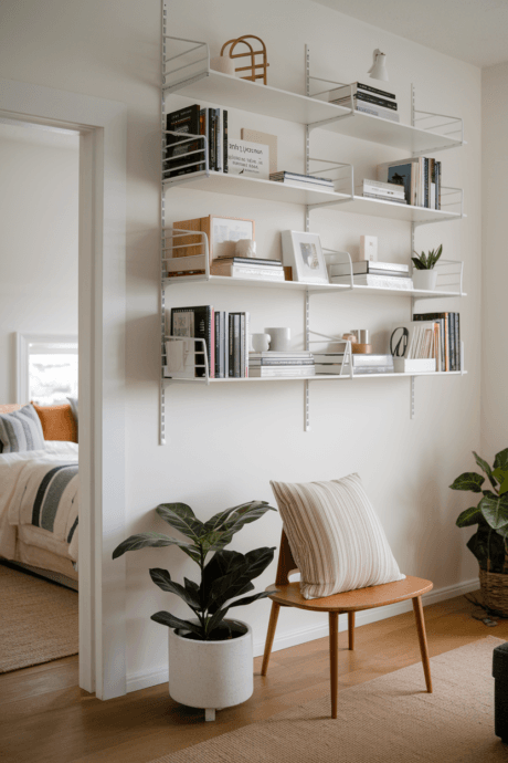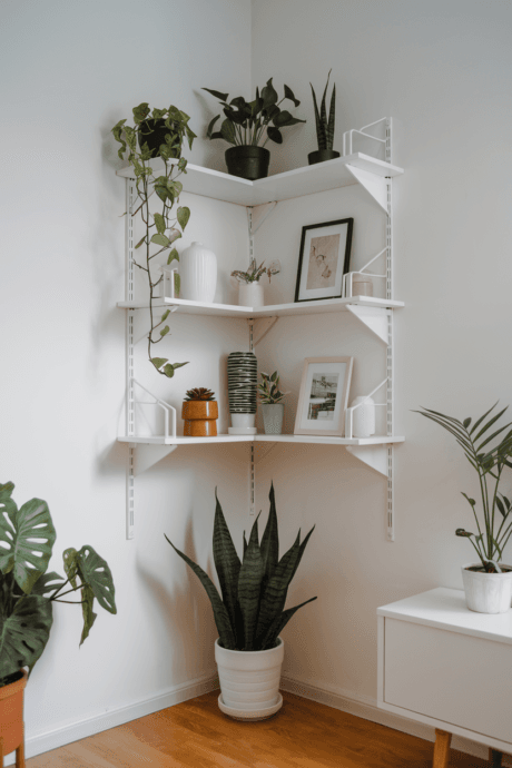 Corners are often overlooked in small apartments, but they offer valuable vertical storage opportunities. Install floating corner shelves to display decorative items or store everyday essentials. The triangular design makes efficient use of otherwise wasted space, while the open shelving keeps rooms feeling airy. Group items in attractive baskets to maintain a clean, organized appearance.