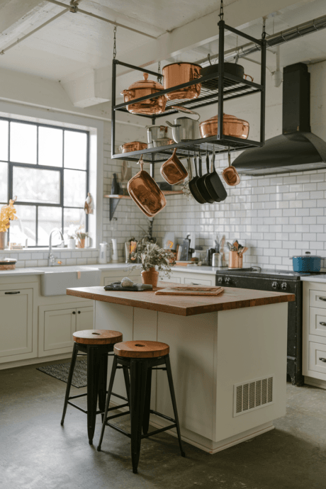 Reclaim cabinet space by installing a ceiling rack for frequently used cookware. Hanging pots and pans from the ceiling not only frees up storage elsewhere but also creates a professional kitchen aesthetic. Position the rack over a kitchen island or peninsula where it won’t interfere with head clearance while making cooking tools easily accessible during meal preparation.