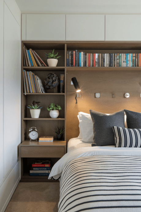 Replace your standard headboard with a storage version featuring built-in shelves or cabinets. These functional pieces eliminate the need for nightstands in tight bedrooms while providing convenient storage for books, reading glasses, and electronics. Some designs include hidden compartments for items you want nearby but out of sight, maximizing bedroom storage without additional furniture.