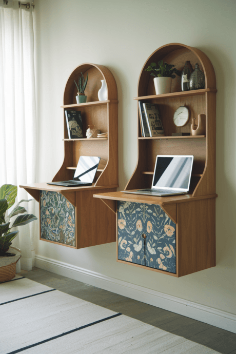 Perfect for small home offices, a wall-mounted desk folds flat against the wall when not in use. These space-saving workstations often include built-in storage compartments for office supplies and can double as a vanity or dining surface. When closed, they resemble a stylish cabinet, maintaining a clean aesthetic while providing full functionality only when needed.