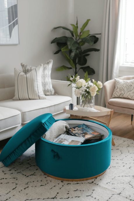 Replace your standard coffee table with a storage ottoman that serves triple duty: seating, surface space, and hidden storage. These multifunctional pieces are perfect for stashing throw blankets, magazines, remote controls, or gaming equipment. Many designs feature a reversible top that functions as a tray when flipped over, creating a stable surface for drinks and snacks.