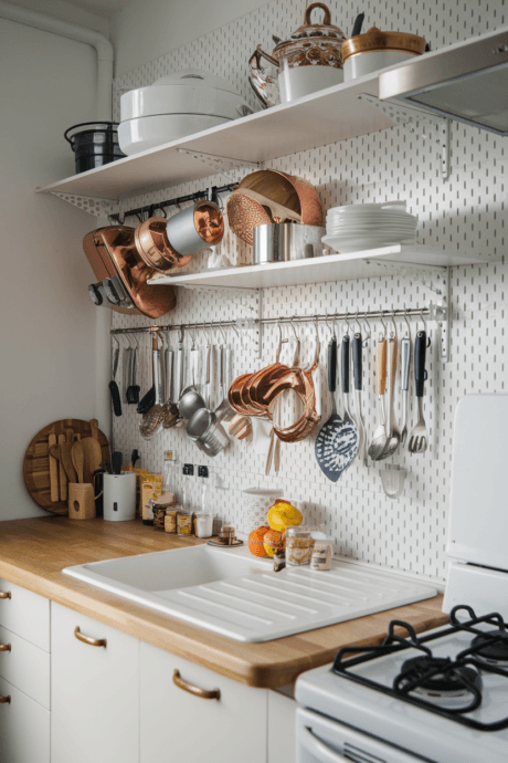 Transform a kitchen or office wall with a customizable pegboard system. This versatile solution allows you to hang kitchen utensils, crafting supplies, or office essentials using hooks, small shelves, and containers that can be rearranged as needed. The visual organization keeps frequently used items accessible while freeing up drawer and counter space for other necessities.