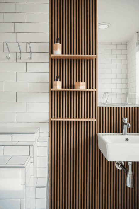 Install a vertical slat wall system on an unused bathroom wall to create infinitely customizable storage. Similar to systems used in retail displays, these grooved panels accept specialized hooks, shelves, baskets, and containers that can be rearranged as needed. The slat system works beautifully for hanging robes, organizing makeup, or displaying decorative items, all while maintaining a sleek, architectural appearance. Choose a waterproof material like PVC in a color that complements your bathroom for a cohesive look. This adaptable solution evolves with your changing storage needs.